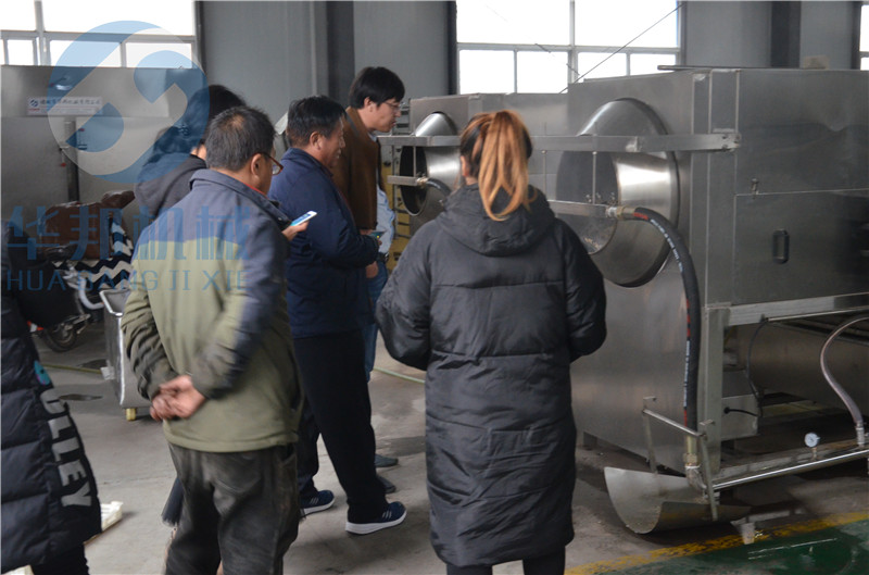 龍大集團一直與我們持續(xù)合作,購買過隧道烘干機、全自動炒鍋、提升機等設備,2018年12月3日冒雨帶1/4與1/8當?shù)睾颂胰?,去皮時間僅用5分鐘,去皮效果很滿意,并達成合作共識。