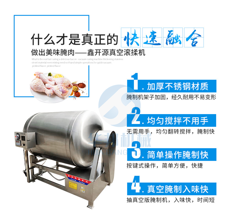 如果您還在為牛肉雞肉鴨肉腌制時間長發(fā)愁,如果您還在苦苦尋找快速腌制機,如果您想提高您的產(chǎn)品產(chǎn)量,那您就需要采購一臺適合您產(chǎn)量的真空滾揉機,采用呼吸式一呼一吸快速腌制的方法,通過對產(chǎn)品的摔打,滾揉,讓您的產(chǎn)品更細膩,腌制速度越快。本來您需要腌制一星期的產(chǎn)品,用我們的滾揉機,您可以在一小時內(nèi)腌制成功,并且比自然腌制的效果更好。