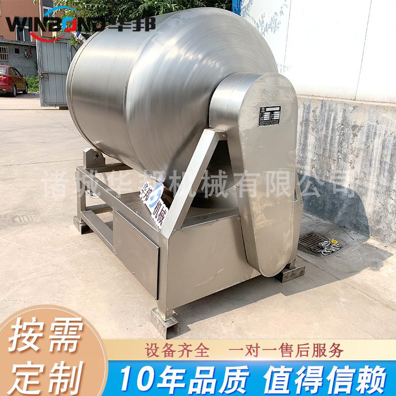 設備整機采用304不銹鋼制造,結構緊湊,滾筒兩端均采用旋壓式封帽結構,增加滾筒內(nèi)的摔打空間,使?jié)L揉產(chǎn)品的效果均勻,噪音小,性能可靠,操作簡便,使用效率更高。具有變頻技術功能,機器使用安全,方便節(jié)能。